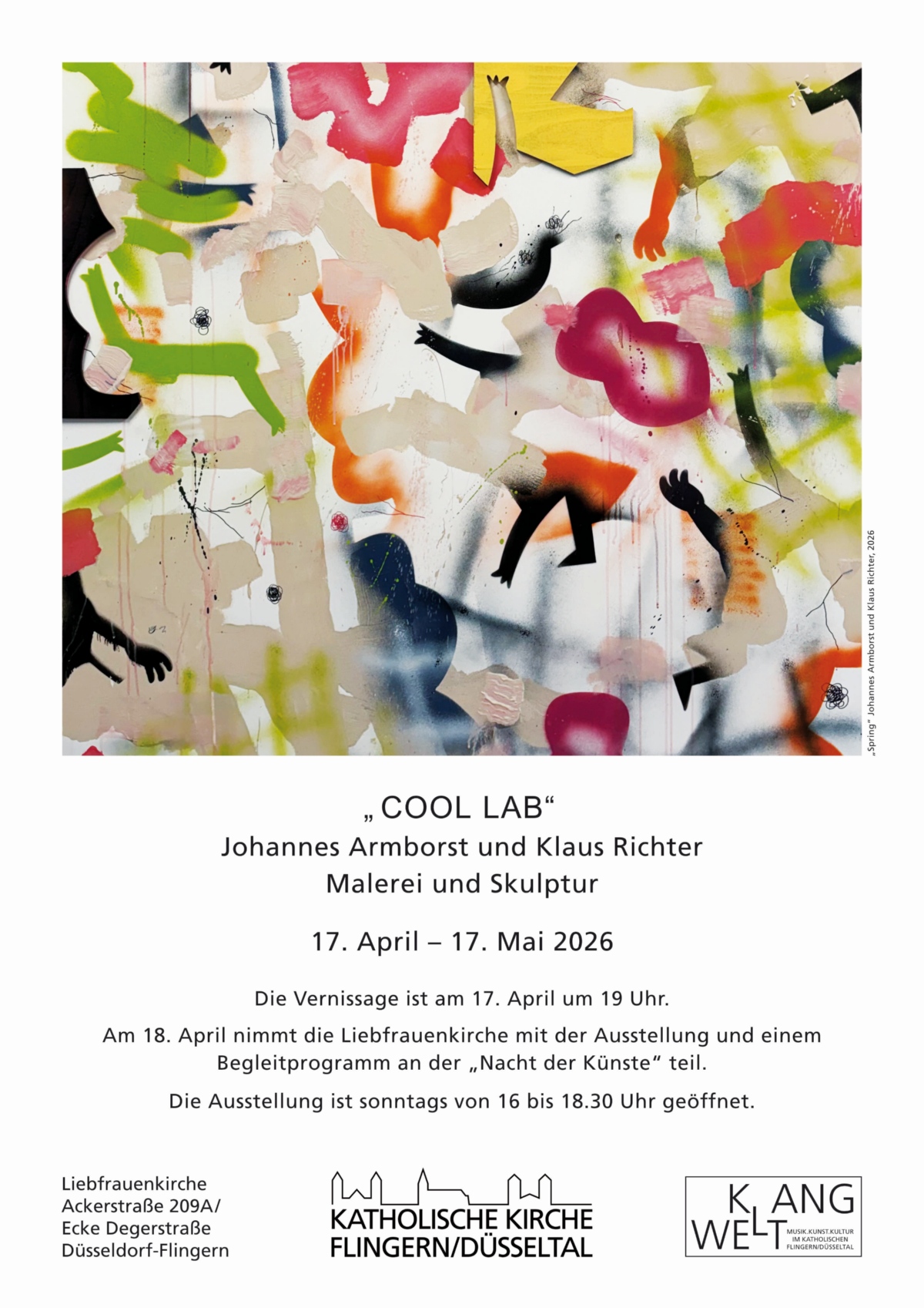 Die Besucher erwartet mit „COOL LAB“ eine spannende Ausstellung der Düsseldorfer Künstler Johannes Armborst und Klaus Richter. Dabei ist auchder Innenraum der neugotischen Kirche mit seiner modernen, frischen Farbgestaltung den eindrucksvollen Glasfenstern und der „Stalaktitendecke“ einen Besuch wert.